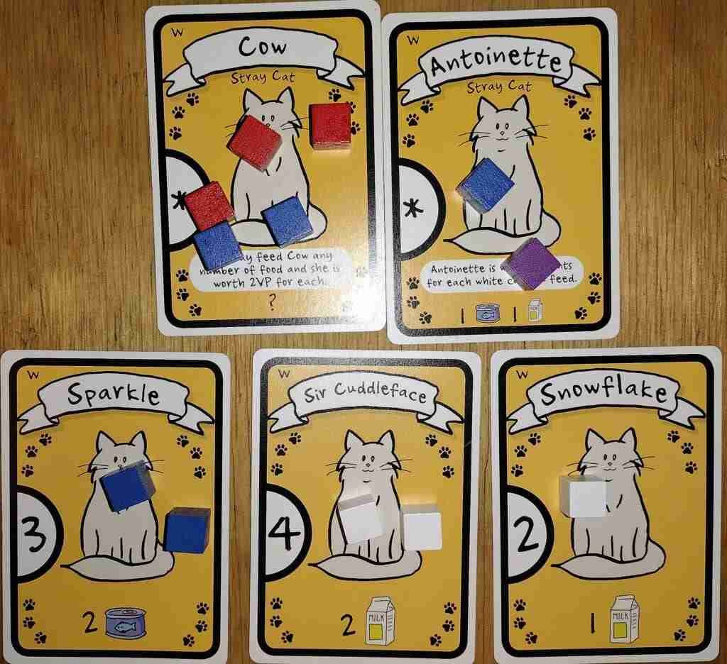 All of these cats are fully fed, so you’d have the following score: 3 (Sparkle) + 4 (Sir Cuddleface) + 2 (Snowflake) + 10 (Antoinette is worth 2 points for every white cat that is fed, and she is also white) + 10 (Cow is worth 2 points for every piece of food you feed her) = 29