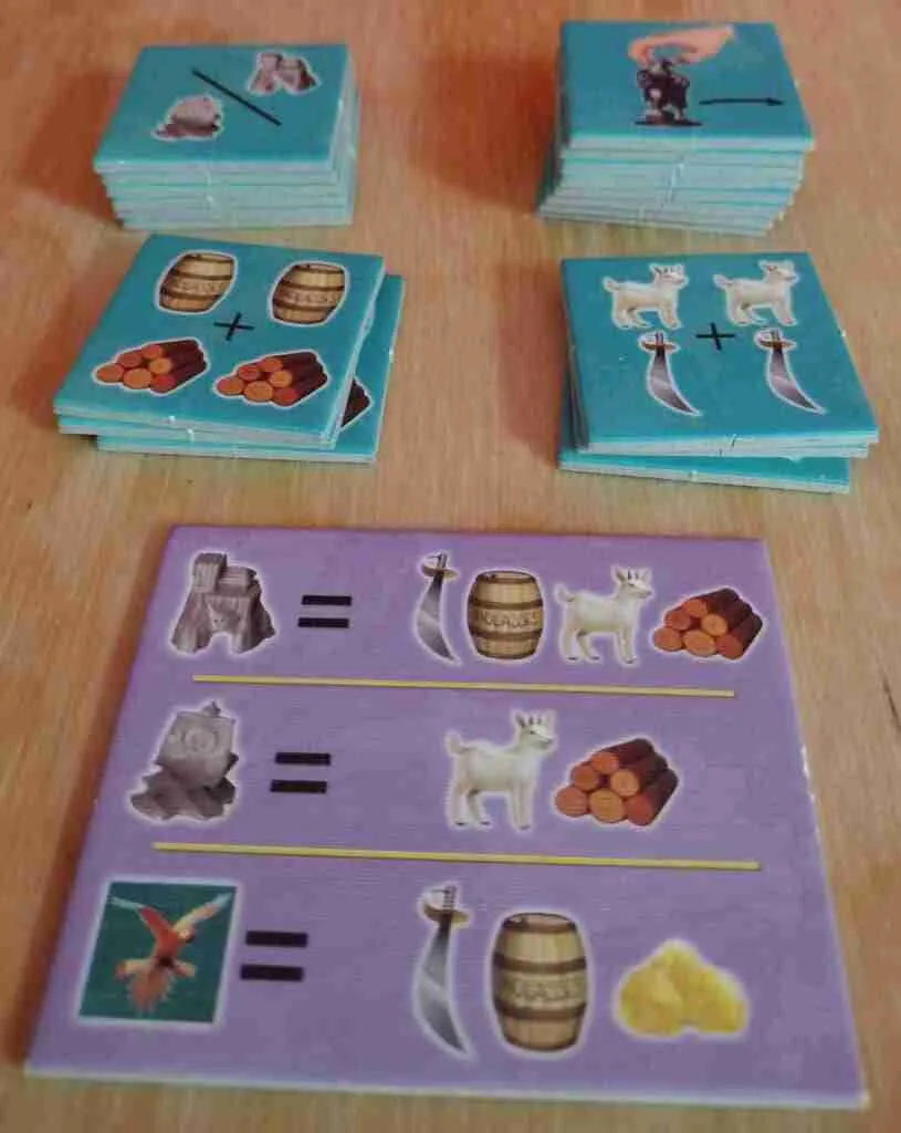 All that aside, Catan Junior is a good game for teaching kids resource management. You need certain resources to build new lairs and ships. The lairs are what get you more resources, but you need them to be connected by ships. You can trade, but not with other players, only with the marketplace or the stockpile. Trading with the marketplace is one-to-one, but only once per turn. If you need to trade with the stockpile, you need to give two of one resource to get one of another resource. There’s no limit on how much you can trade with the stockpile.