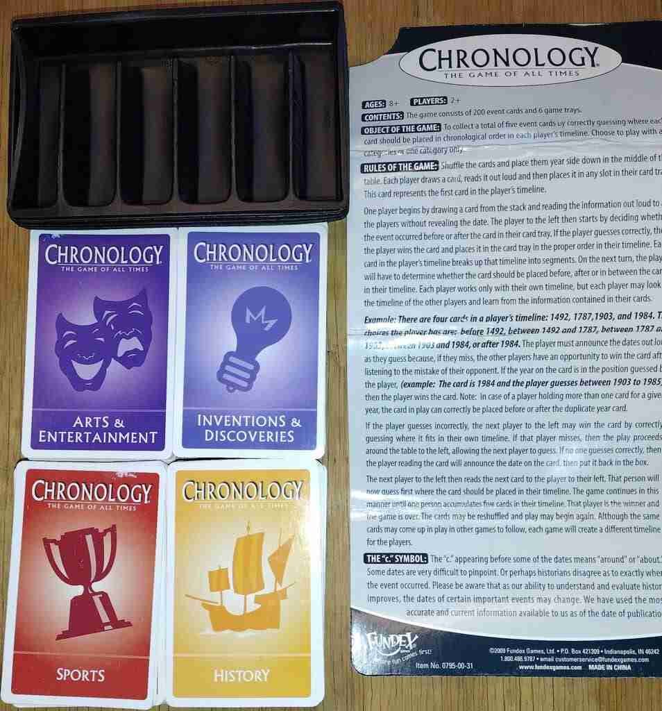 If you would like a game to cover all of history, Chronology and Timeline are your best bets. While Timeline does not require reading as it is picture-based, Chronology does have lots of words and requires reading for some of the players.