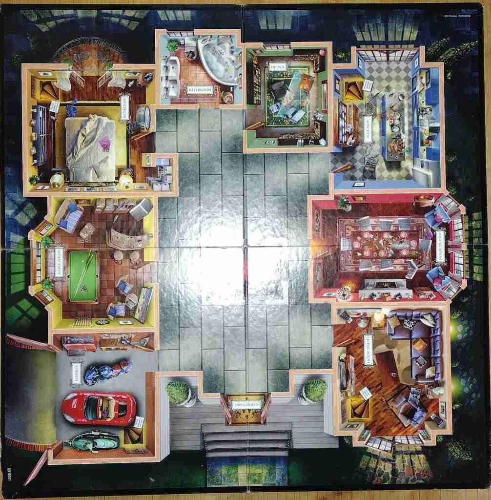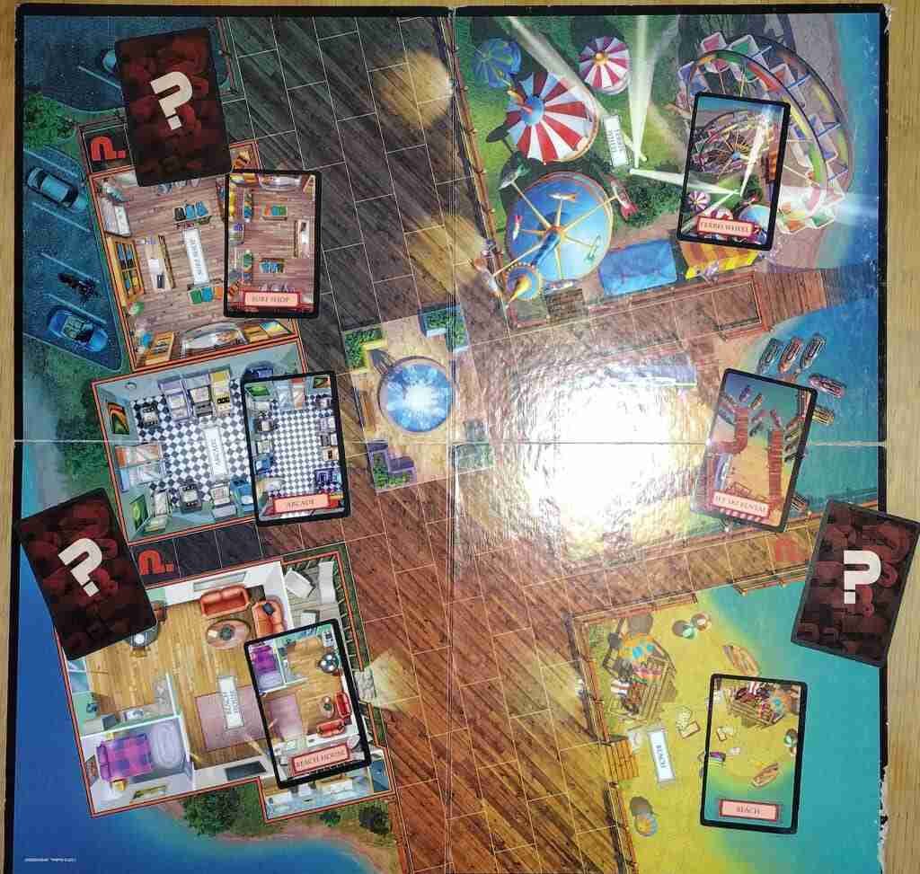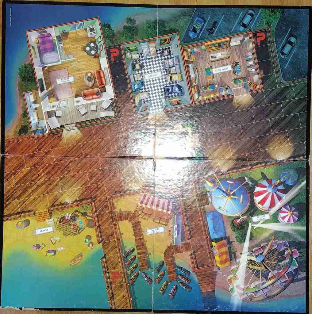 The orginal game includes the courtyard, office, bathroom, kitchen, bedroom, living room, game room, dining room, and garage. The boardwalk side of our gameboard includes a surf shop, arcade, beach house, beach, jet ski rental, and ferris wheel. In addition, our boardwalk side of the game uses three extra question mark cards, which allow you to ask one additional question, take a card from each player to mark your Clue sheet, or see two extra cards from another player.