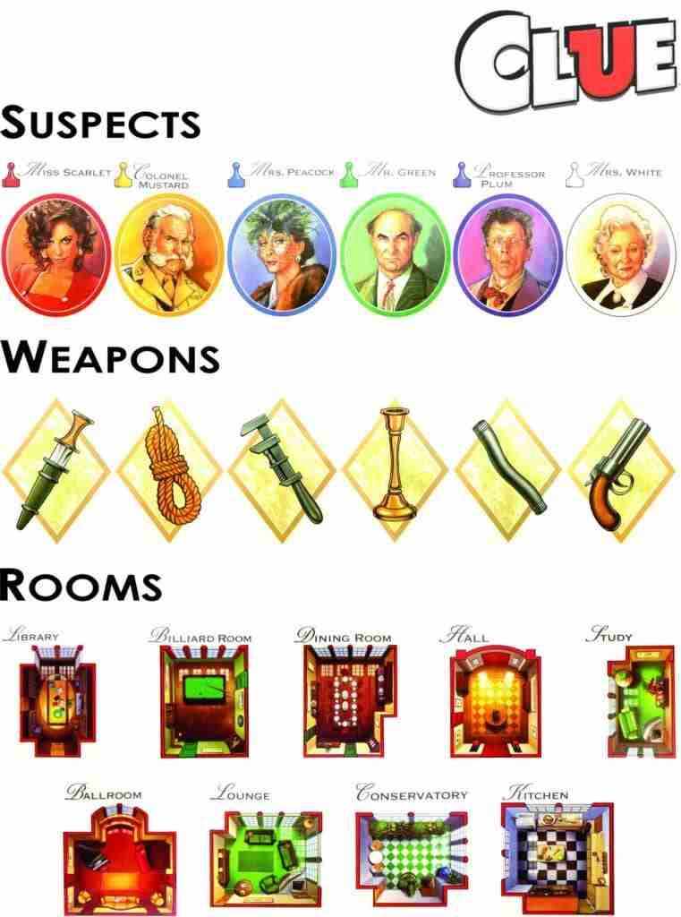 There are usually 5-6 possible people that could have committed the crime in question. They are represented both by the cards and by the pawns. We have a mostly original version, so have Green, Plum, Scarlet, Peacock, Mustard, and White.