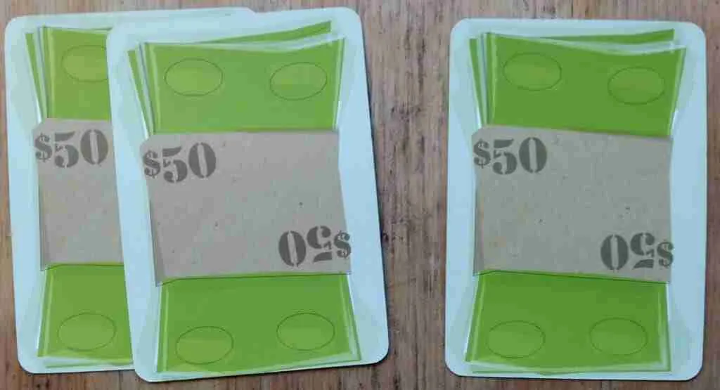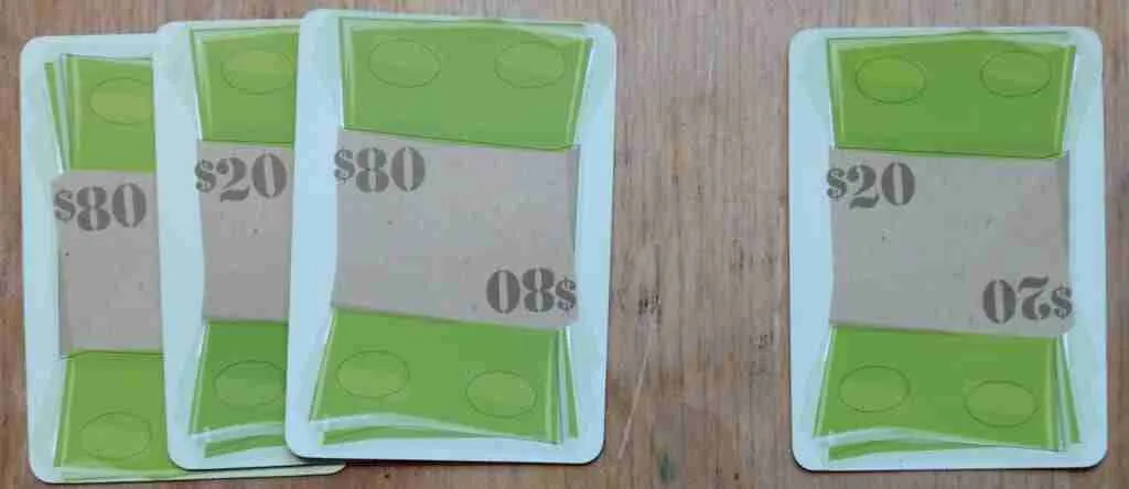 Once all internal stacks are created, then the fun begins! Use the cards still in your hand to steal other players’ stacks, or add on to your own. This is where the order of those initial stacks can really matter. If you placed the $70 card on top of the $30 card, then someone else can steal your stack with a $30 card, but then you can steal it back with your $70 card!