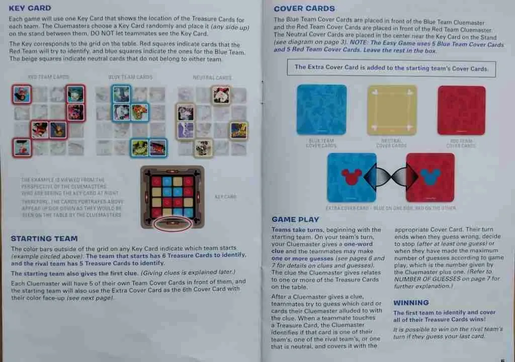 Before setting up, decide if you want an easier 4×4 grid or a more challenging game with a 5×5 grid. Then, lay out your cards so they’re facing the guessers. Each card has a picture side and a name side, so you can choose to play with the names up (and therefore require reading). We prefer to play with picture-side up, especially as we haven’t seen all the Disney movies.