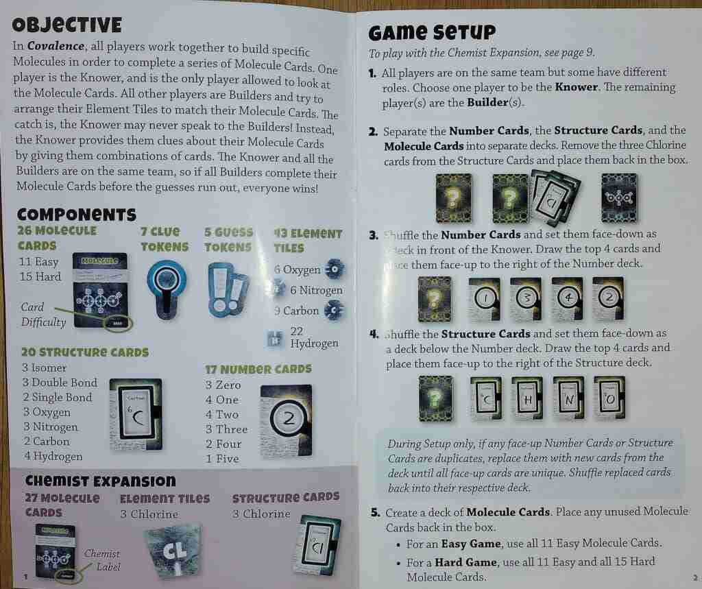 To play Covalence, choose one person to be the Knower/Clue Giver and the rest are working together to try to build their chemical formulas. Everyone gets 3-4 chemicals to build, but they don’t get to look at their cards. Only the one giving the clues can look at the cards.
