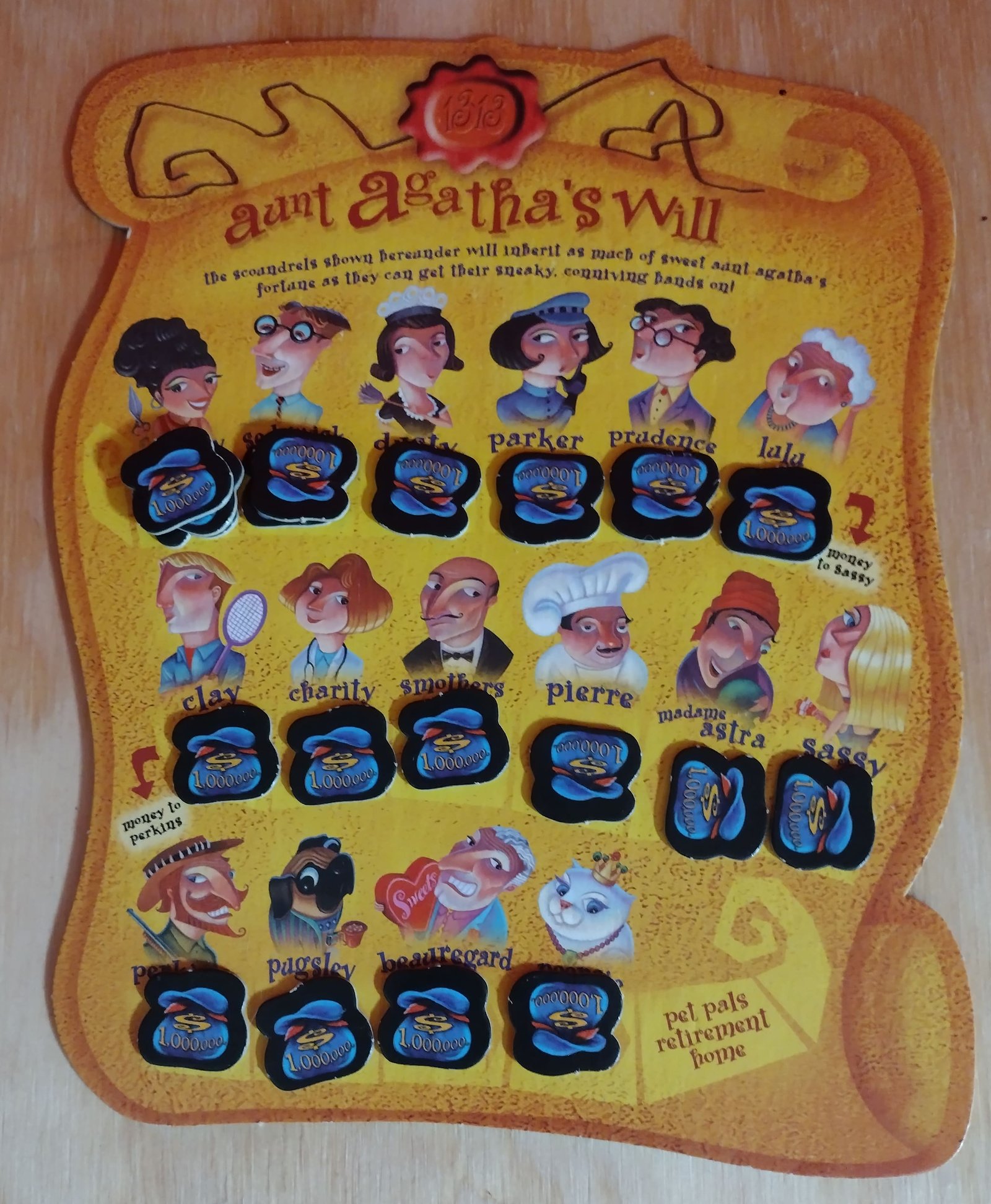 Your rich Aunt Agatha has died and left her money to her various relatives and staff. Spritzy starts with 4 million, Sedgwick with 2 million, and everyone else starts with 1 million. Each player has the cards for 4-6 different heirs, but anyone can move any of the actual game pieces around. If Spritzy dies, her 4 million is moved onto the next character on the will – Sedgwick. This means that the other players are trying to kill off your characters while you’re trying to kill off theirs, and everyone is trying to make their way out of Aunt Agatha’s mansion. And did I mention that these heir cards can be stolen? So you might not even end the game controlling the same characters you started with.
