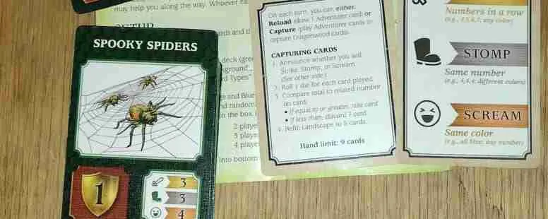 Stomping on the Spooky Spiders. Two cards of the same number mean you roll two dice. A total of 4 beats the spider’s 3 necessary for the stomp, so you get to keep the Spooky Spiders (they’re worth 1 point).