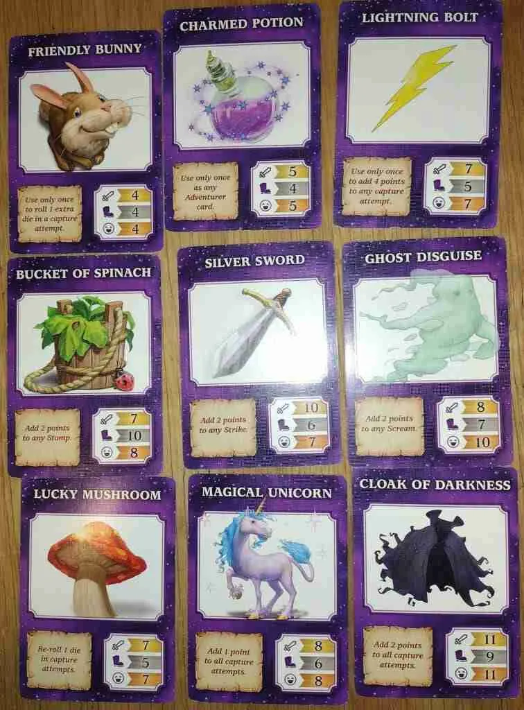 Each of the creature cards are worth a different number of points; between 1 and 7. Every creature card and every enhancement card can be captured one of three ways: with a stomp attack, a scream attack, or a strike attack. You use your adventurer cards to determine which attack you will make.