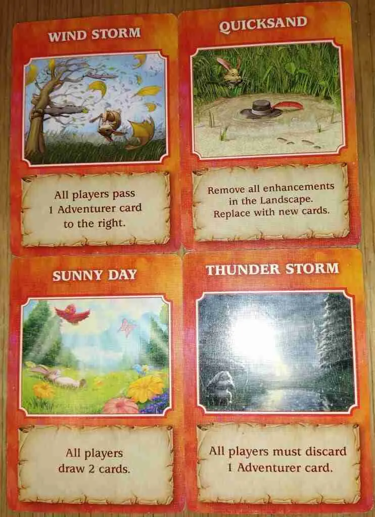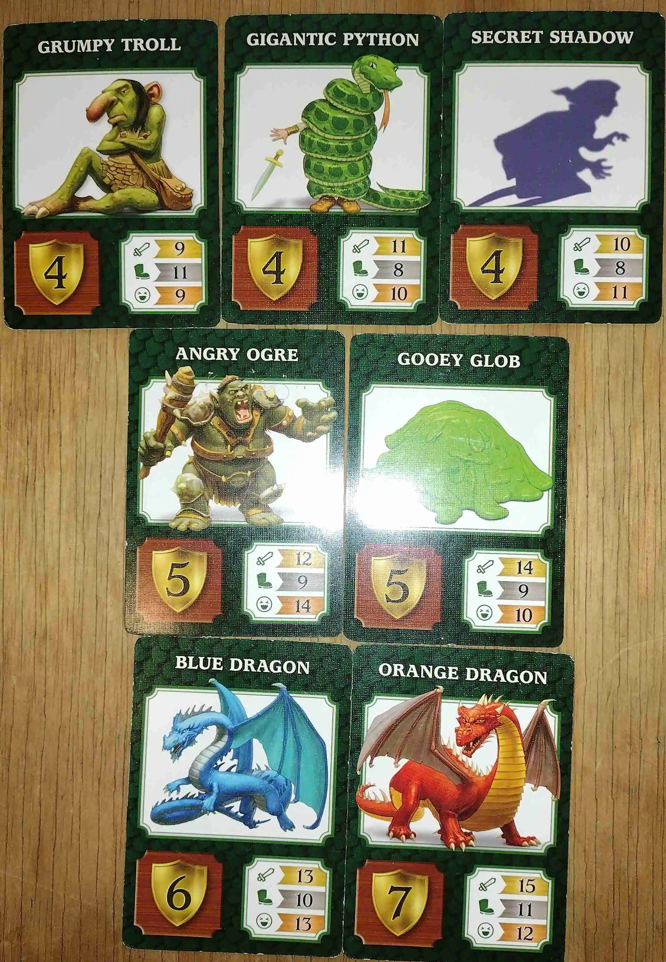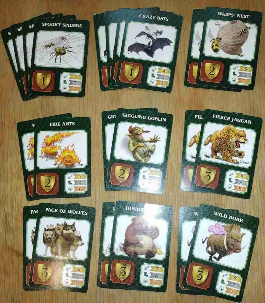 Adventurer cards are one of five suits, and numbered 1-12 (there are also four Lucky Ladybugs in this deck; these allow you to draw two extra cards). So when you want to capture one of the creature or enhancement cards, you use up to six cards from your hand in one of the three attacks.