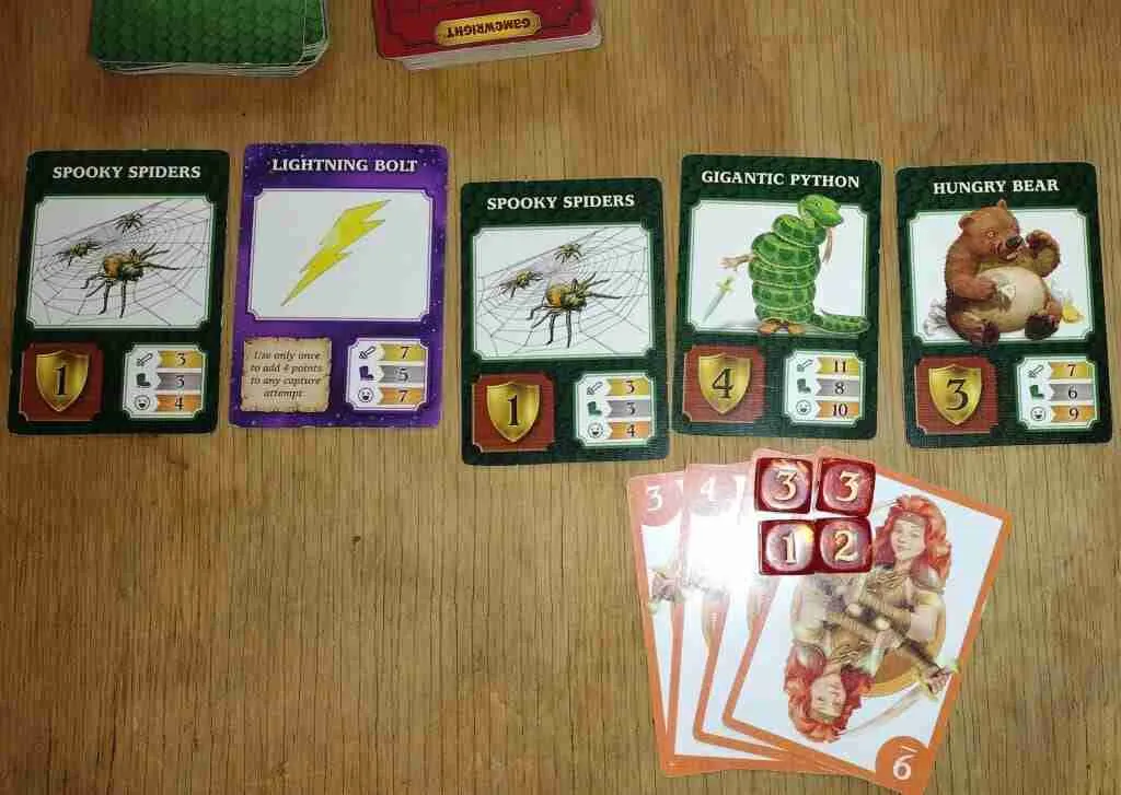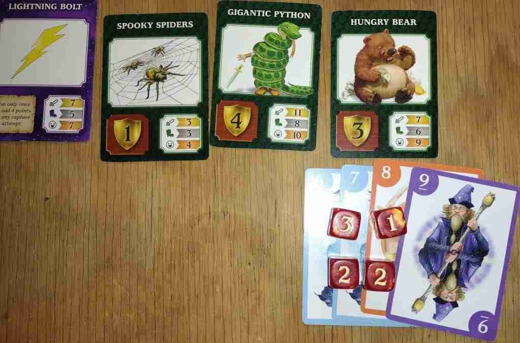 Once you have your attack formulated, you pick up the same number of dice as cards you used in your attack. Dice are numbered 1-4, with two 2s and two 3s. Roll the dice and add them up. If the total is greater than or equal to the number on the card for the corresponding attack, then you capture the creature or enhancement.