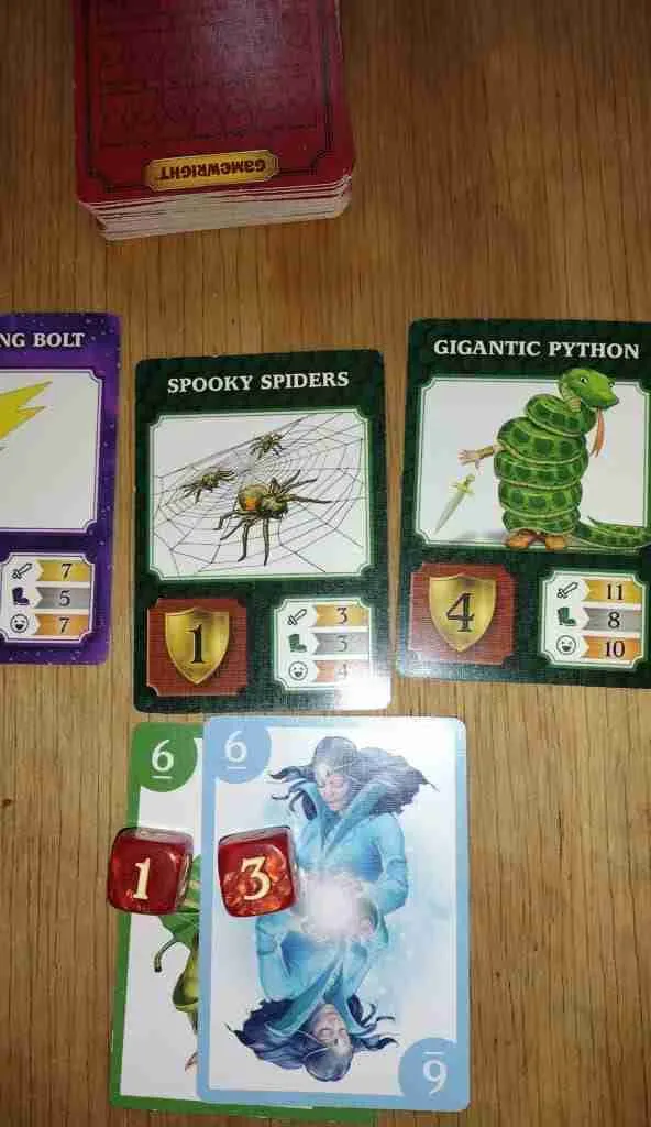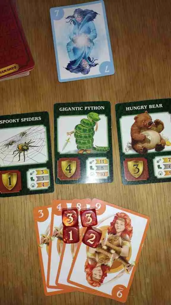 In this scream attack against the Gigantic Python, rolling a 1, two 3s, and a 2 is not enough to beat the python’s 10 against scream. So, the card above is discarded, and this attack is saved for later.