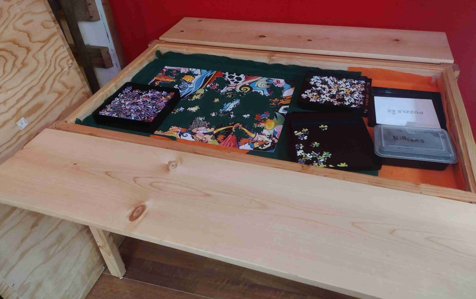 When we moved into our bus, one of my requests was that my husband make me a gaming table. I was tired of feeling like we couldn’t work on a puzzle because it would take up the whole table and we wouldn’t be able to eat around it, or having to plan when to play our bigger and longer games for the same reason. (Which let’s face it, means those games don’t get played at all.)