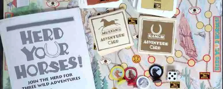 Game components consist of the board, ranch horse cards, mustang cards, ranch adventure cards, mustang adventure cards, a regular 6-sided die, and stallion playing pieces. The different games use these different components in different ways, but the basic premise is you start at âstartâ and move through the paths on the game board toward Green River Valley with a goal to collect as many horses along your way as possible. Along your path, you will encounter different danger spots, adventure card spots (which may be good or bad), and spots allowing you to draw another horse card.