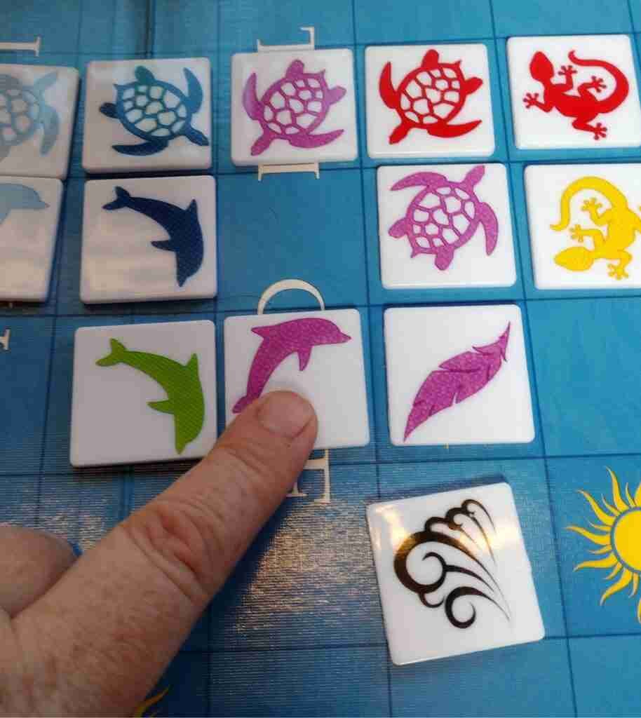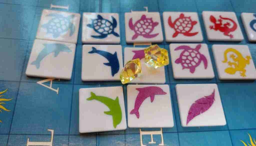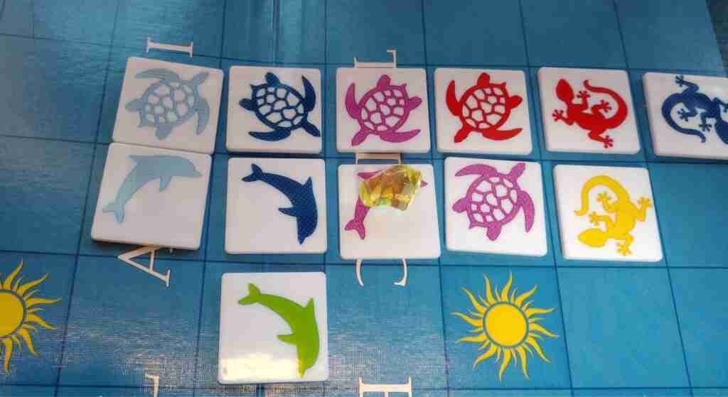 On all other turns, players place one tile touching at least one other tile (not diagonally; sides must touch). All touching sides must match either color or shape. If the new tile touches (and therefore matches) more than one tile on the board, that player earns a stone. Players also earn stones for playing a piece on a sun square.