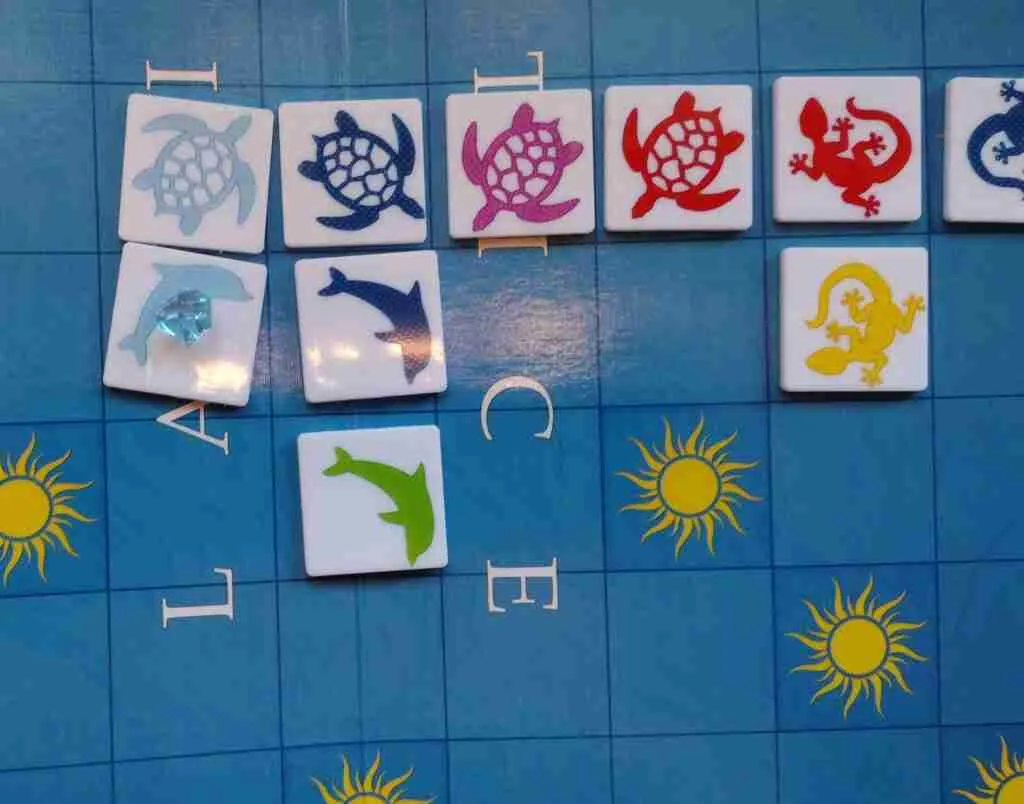Regular tiles have one of six colors and one of six shapes on them. There are also 12 wind tiles. The first player places any regular tile (from their rack) on the center square and draws a new tile from their pool to place on their rack.