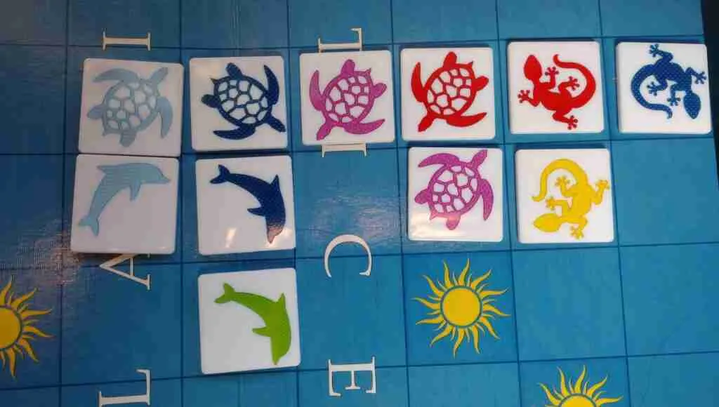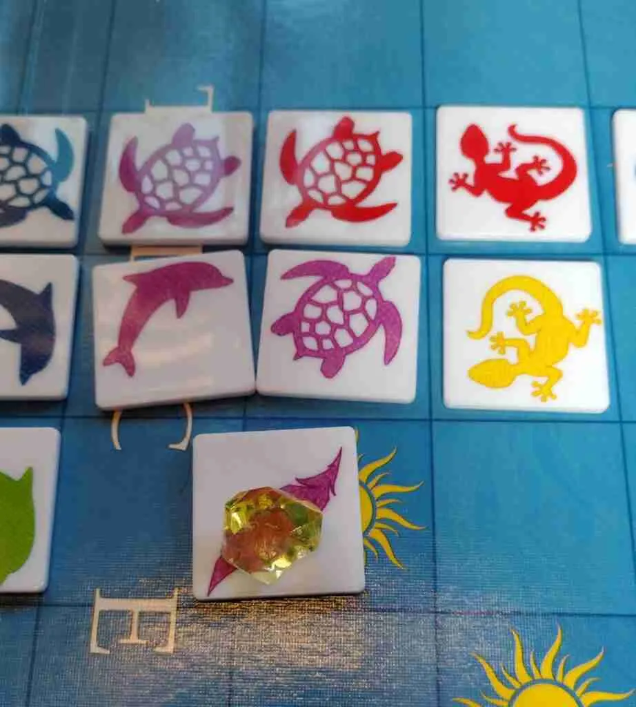 On all other turns, players place one tile touching at least one other tile (not diagonally; sides must touch). All touching sides must match either color or shape. If the new tile touches (and therefore matches) more than one tile on the board, that player earns a stone. Players also earn stones for playing a piece on a sun square.