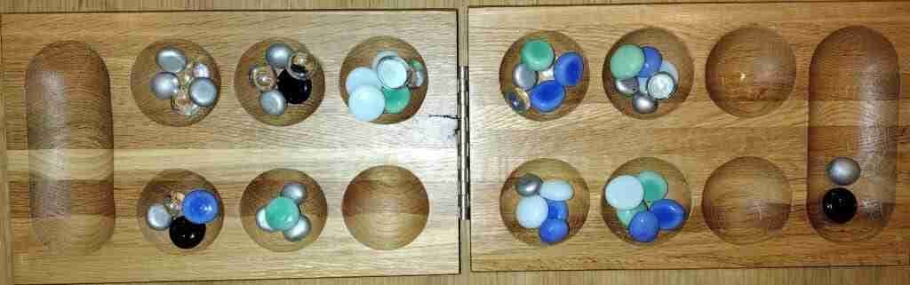 If your last stone dropped is in your own pocket, which was previously empty, you get to collect both the stone you just dropped in your empty pocket AND the stone(s) in your opponent’s opposite pocket and place all of those stones in your store. For this reason, you want to avoid collecting a large number of stones in just one pocket. You don’t want your opponent to be able to collect them!