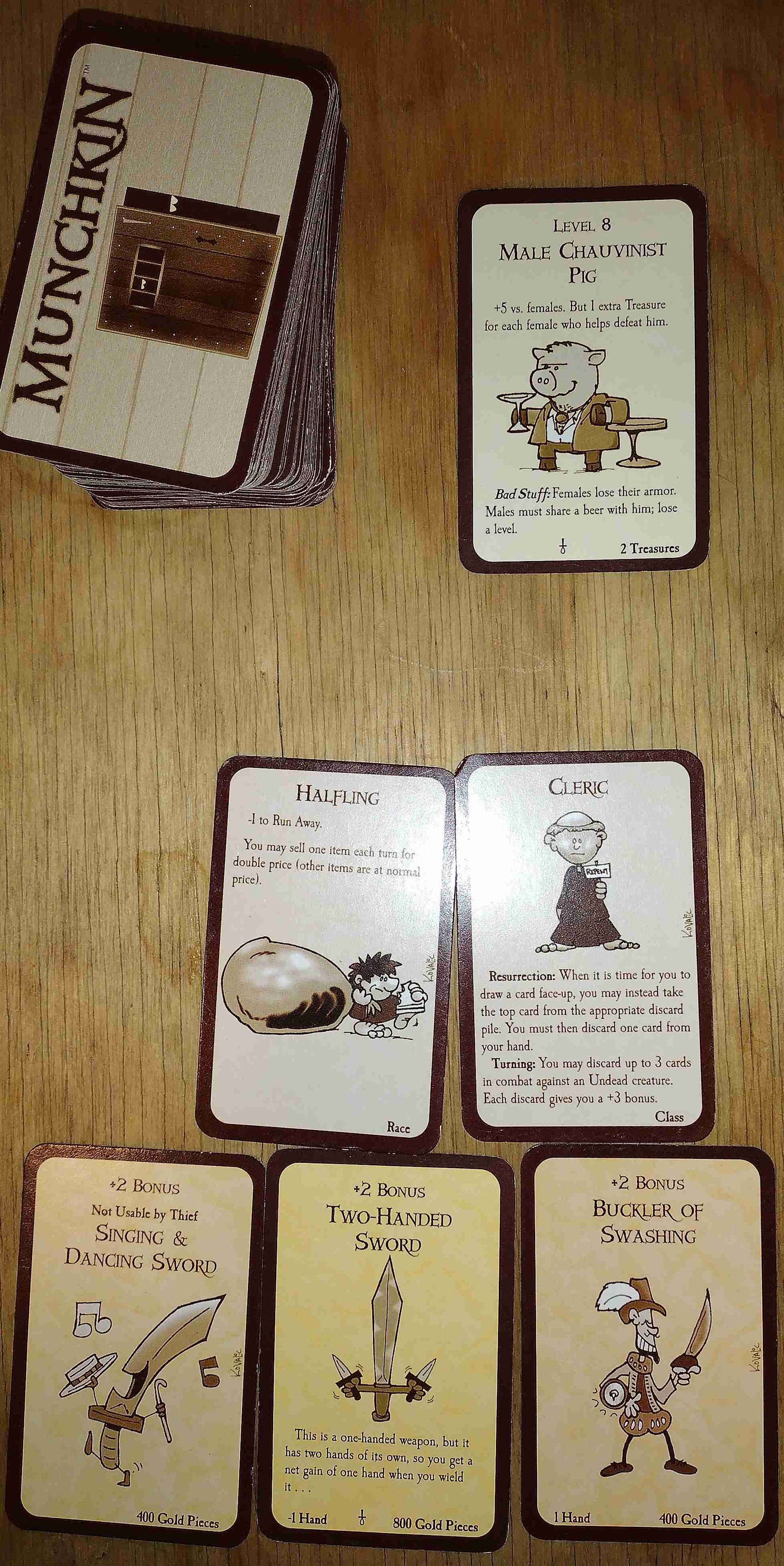 If you are this halfling cleric and open the door to find this Level 8 Male Chauvinist Pig, you would need to be at least a level 3 in order to beat it by yourself. With the addition of your three bonus cards, that would put you at level 9. If you don’t have at least 3 levels, you could ask for help and beat it that way.