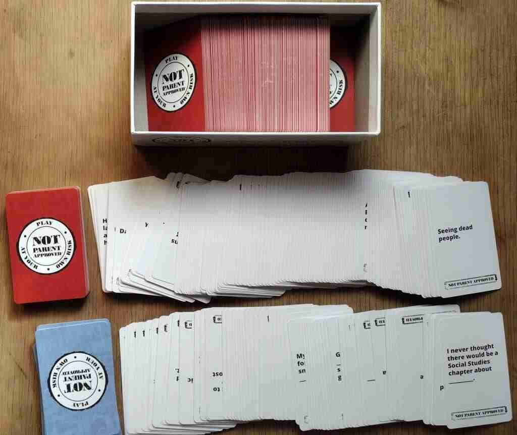 Many of the cards in this version are gross. Poop, farts, boogers, and hygiene (or lack thereof) are common themes, though not the only cards. There’s a reason this game is called “Not Parent Approved.” However, we have not come across any sexual cards, making it more appropriate than Cards Against Humanity.