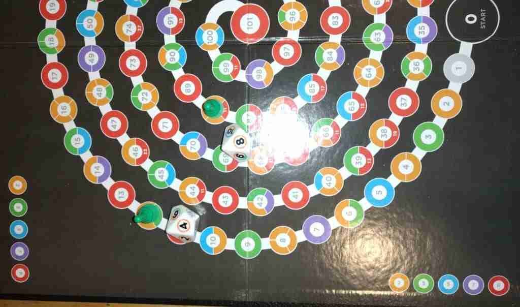 All players begin on START, or 0. Every player has two pawns. There are two dice to roll. Two oversized d10s (10-sided dice) with the numbers 1-10 that have the same colored rings around them as is present in the rest of the game. Roll both dice. If you roll doubles (the same number on both dice), use that number four times. Otherwise, use each number once. If you roll an 8 and a 4, you use the 8 and 4 separately. You do not have a 12 to use, nor do you have 32, or even 48.