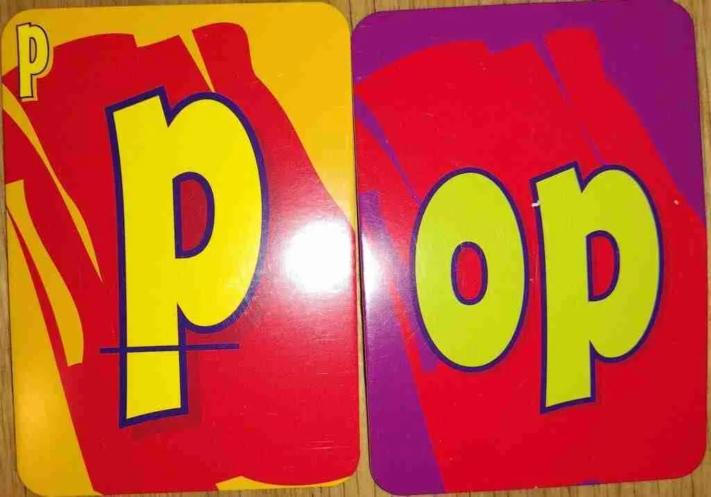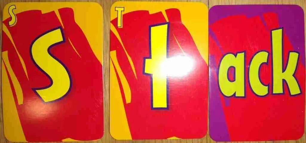 There are two decks of cards in the game; word family cards that have a vowel and a consonant, and consonant cards. Word family cards are on the table and turned right-side-up one at a time. Consonant cards are dealt out to the players; each player has a hand of three cards.