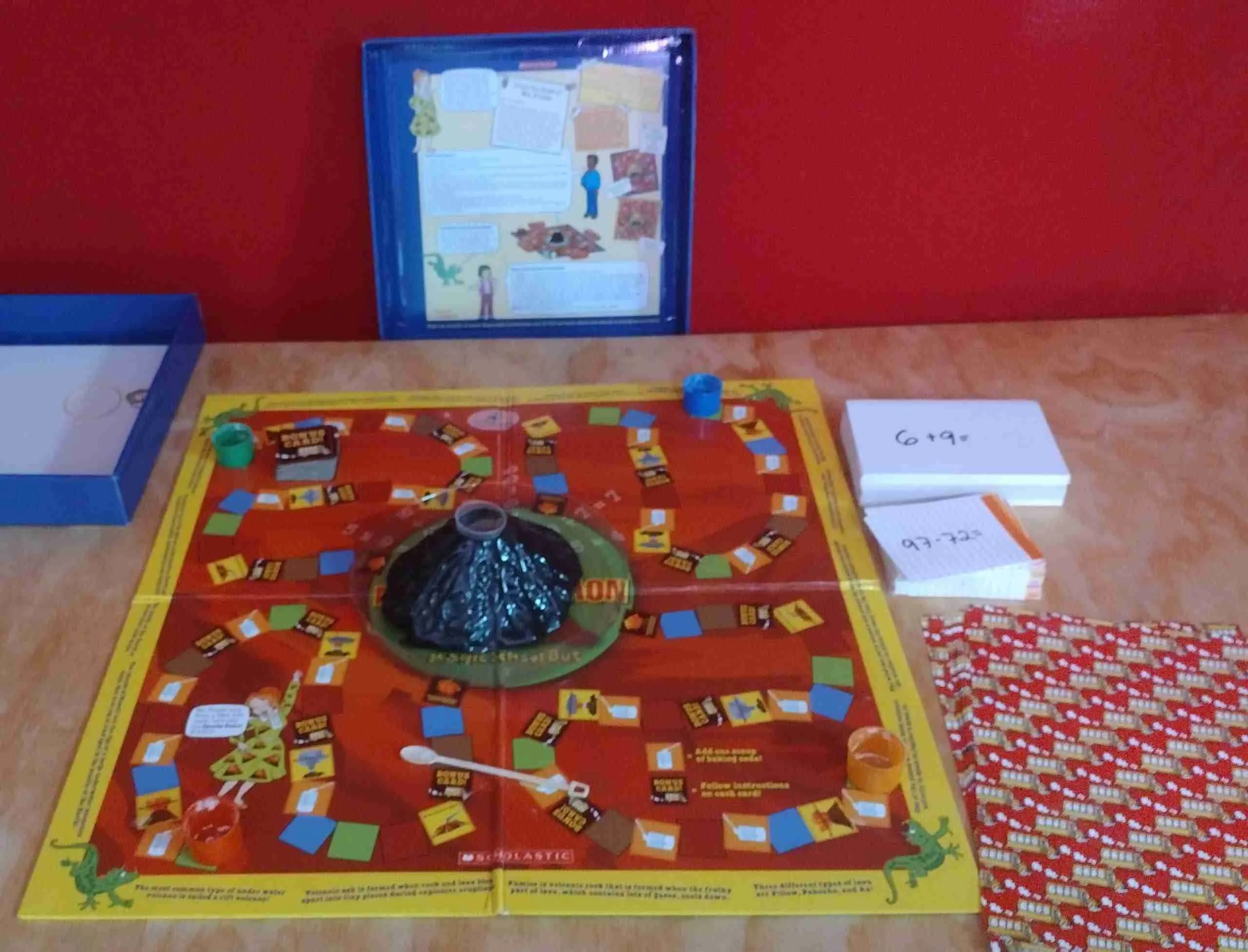 When I first opened the box to Math Explosion, I was dismayed at its cheapness. The box is such that the only way to store all the game components in it, is for the volcano to be folded, which can