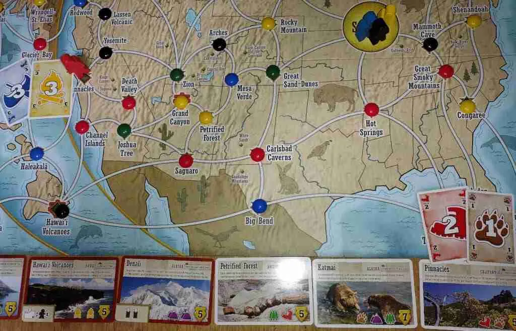 The gameplay has elements of Ticket To Ride, and a little of Pandemic. In addition to the national park cards, there are Trek cards. With each turn, you can draw up to two trek cards. (You get two actions each turn, with drawing a trek card being one possible action.) There is a hand size limit of 12. Each trek card has a picture and a number. The number can be used for traveling OR the picture can be used to claim or occupy a park. So, you have limited cards in which to accomplish your goal. However, the overall feel is much more laid-back than Pandemic, and less competitive than Ticket To Ride.